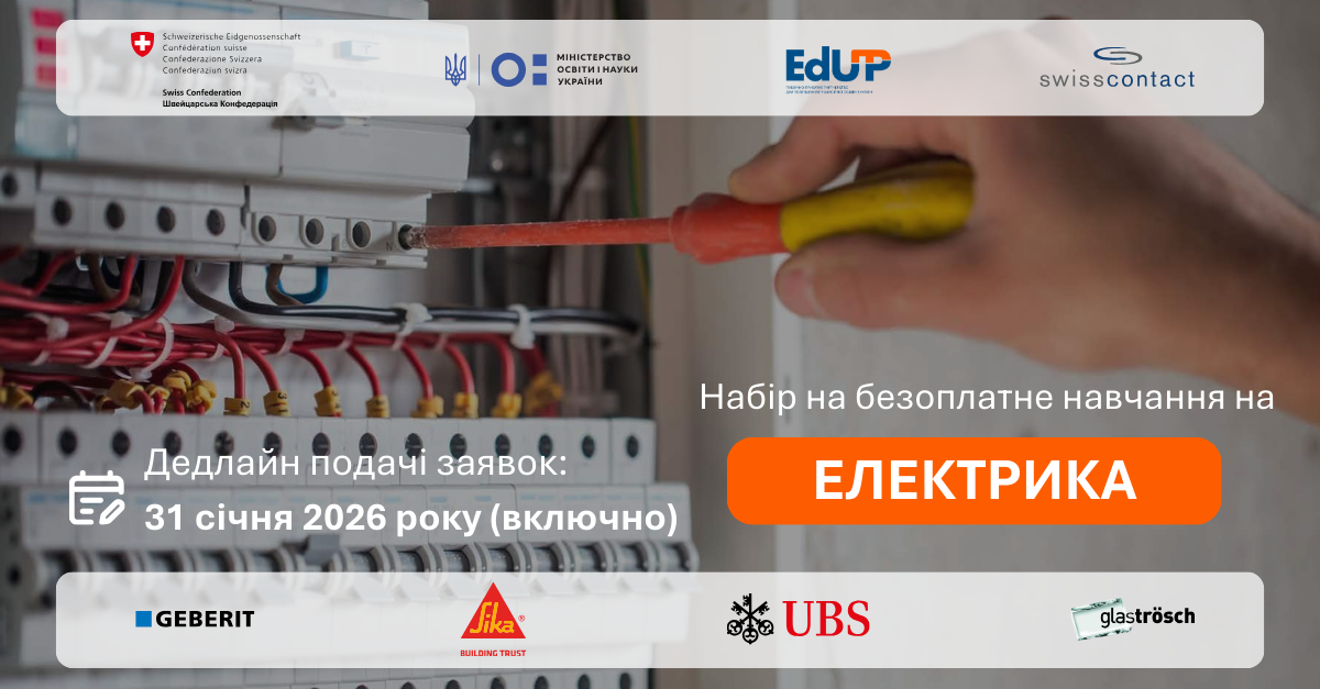 Заклад професійної (професійно-технічної) освіти «Харківський професійний коледж будівництва та промисловості» оголошує набір на безоплатне професійне навчання за трьома професіями — електрик, зварник та сантехнік у межах проєкту EdUP.